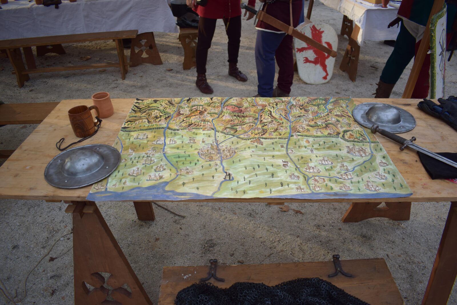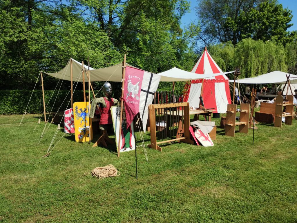 Tende e padiglioni realizzati secondo modelli medievali, con teli in lino o canapa e strutture in legno. Arredi da campo come tavoli, panche, scranni e cofani, ricostruiti sulla base di reperti museali e fonti iconografiche.
