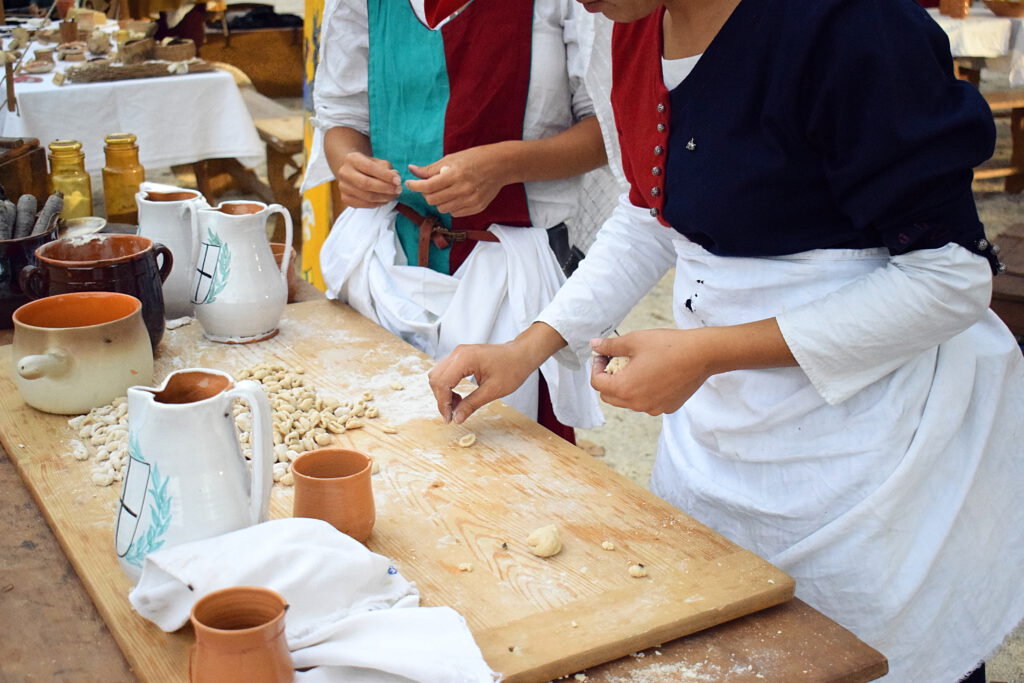 Unite alle attività più tipicamente militari come l’addestramento alle armi, vengono riproposte in campo attività più comuni come la preparazione di cibi e bevande. La cucina rappresenta uno degli aspetti più affascinanti e coinvolgenti della nostra rievocazione storica.