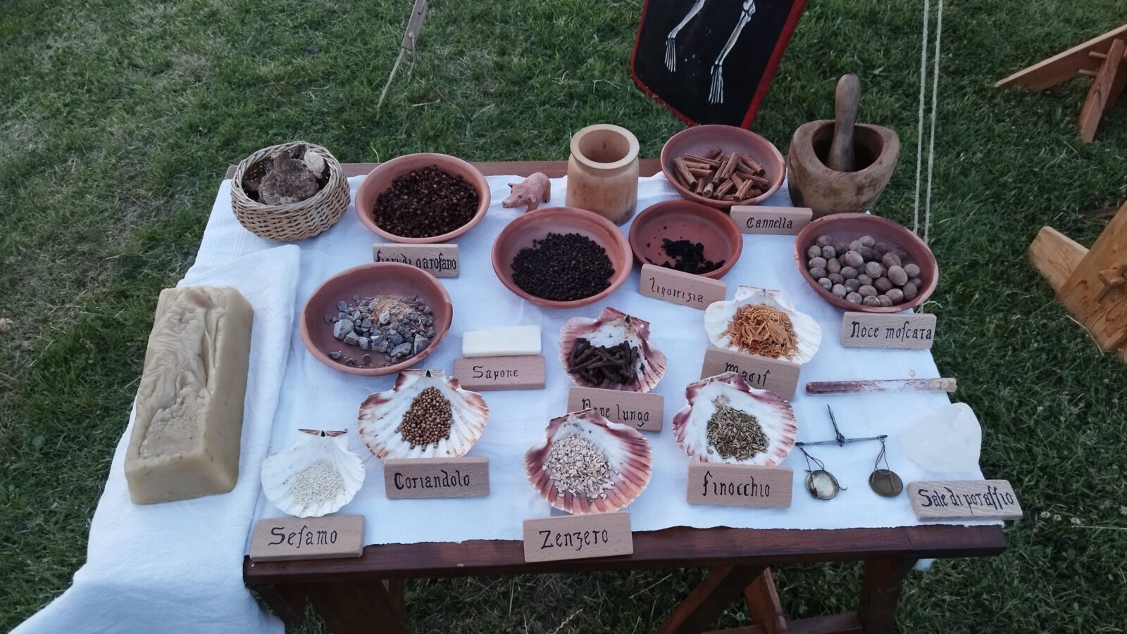 Lo studio dell’utilizzo delle spezie in cucina nel medioevo è fortemente legato alla pratica medica dell’epoca. La nostra ricerca ci ha portato a raccogliere una serie di informazioni sull’uso medicinale di spezie, aromi, piante e minerali, permettendoci di allestire in campo un banco che riproduce quello di uno speziale del primo 1400.